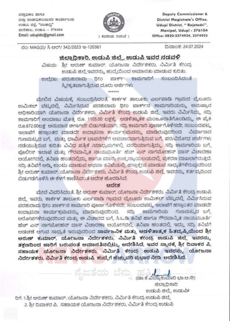 Karkala : ಪರಶುರಾಮ ಥೀಂ ಪಾರ್ಕ್ ಹಗರಣದಲ್ಲಿ ಮೊದಲ ವಿಕೆಟ್ ಪತನ – ಉಡುಪಿ ನಿರ್ಮಿತಿ ಕೇಂದ್ರದ ಯೋಜನಾ ನಿರ್ದೇಶಕ ಅರುಣ್ ಕುಮಾರ್ ಅಮಾನತು